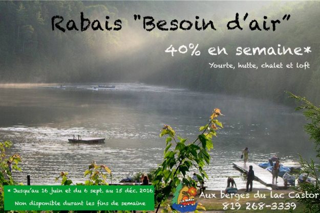100 coupons rabais « Besoin d’air » (40% de réduction) pour des séjours en semaine, en basse saison. Vous n’avez qu’à lâcher un coup de fil au 819 268-3339. Partager la nouvelle.