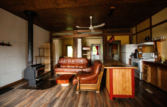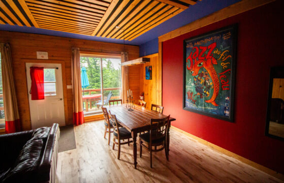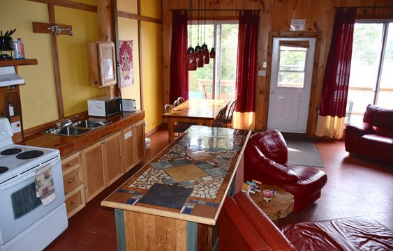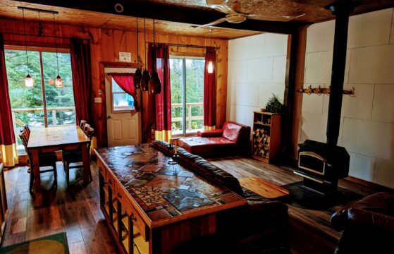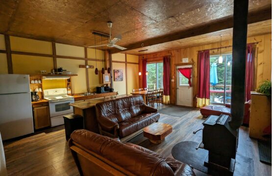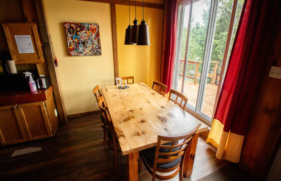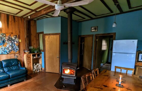 Ce loft, à aire ouverte, est aménagé avec un « coin cuisine » tout équipé et muni d’un îlot central, un « coin salle à manger » avec une table et six chaises, un « coin dodo » délimité par des rideaux ainsi qu’une salle de bain avec douche et toilette. On y retrouve un lit double avec un lit simple au dessus ainsi qu’un matelas simple dans un tiroir sous le lit double. Vous devez apporter votre literie (sac de couchage ou draps et couvertures, ainsi que vos serviettes). L’habitation est munie d’un chauffage électrique d’appoint et est chauffée avec un poêle à bois situé au centre du loft. Autour de celui-ci, il y a sofa et deux petits fauteuils. Entre la mi-octobre et la mi-mai nous fournissons le bois pour chauffer le bâtiment. Ce loft est souvent utilisé par des artistes pour des séjours de création.